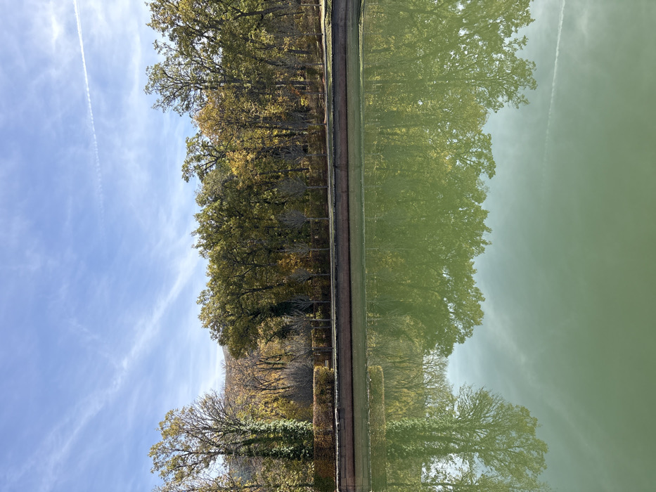 The image depicts a static landscape scene in San Ildefonso, Spain, showcasing a body of water reflecting an autumnal forest line and sky. The upper third of the frame consists of a bright blue sky populated by wispy white cirrus clouds and a prominent linear contrail extending across the upper right. Below the sky, a dense line of deciduous trees exhibits foliage in various shades of green, yellow, and brown, consistent with late autumn. Notable ivy growth is visible on the trunks of several trees on the far left. A formally trimmed, low hedge, displaying both green and brown leaves, runs horizontally along the land's edge, behind which a row of uniformly spaced, slender, bare deciduous trees with pruned branches is situated. A reddish-brown stone retaining wall marks the immediate boundary between the terrestrial elements and the water. The lower half of the image is occupied by a calm, greenish-blue body of water. This surface functions as a mirror, clearly reflecting the overhead sky, clouds, contrail, and the entire forest line, with the reflections exhibiting a slightly muted and tinted quality from the water's hue. No individuals or dynamic actions are present in the scene.