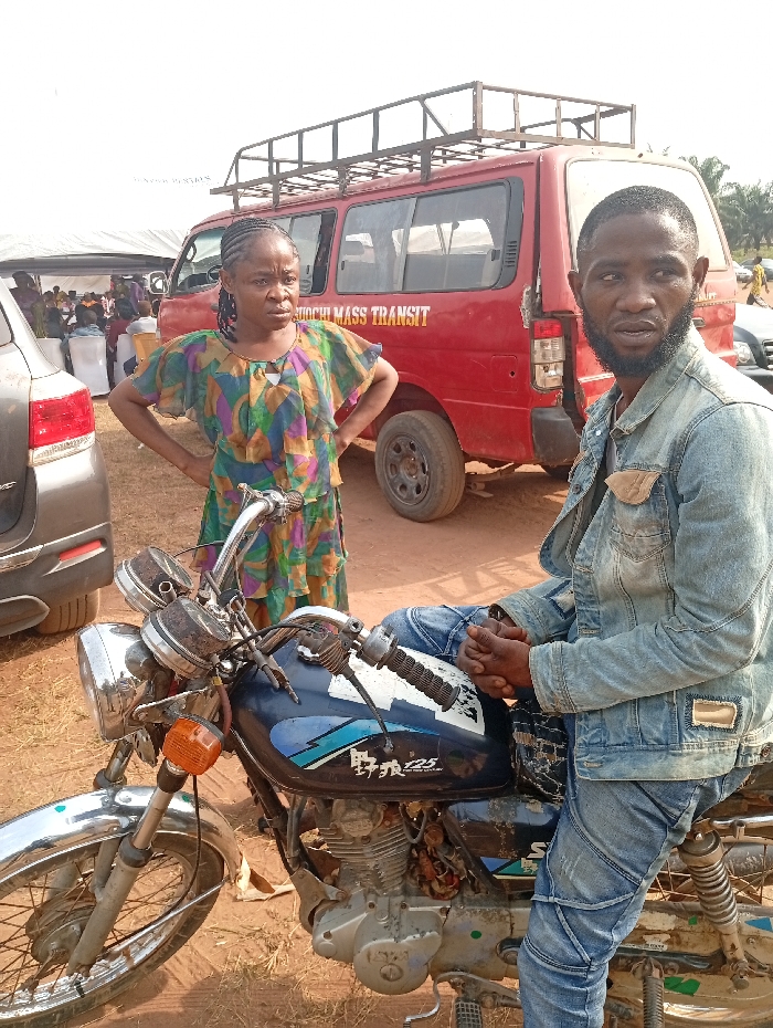 A man sits on a dusty motorcycle, his hands clasped. He wears a denim jacket and jeans. A woman stands beside him with her hands on her hips, dressed in a patterned top. Behind them, a red van labeled "UZOCHUKWU MASS TRANSIT" is visible. A grey SUV is also present on the left side of the image. People and a white tent are visible in the background.