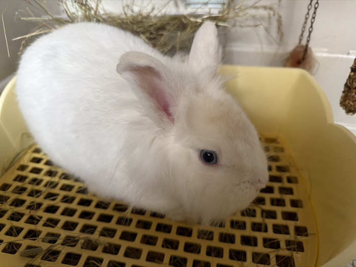 A white rabbit is situated within a yellow, grid-patterned plastic tray or litter box