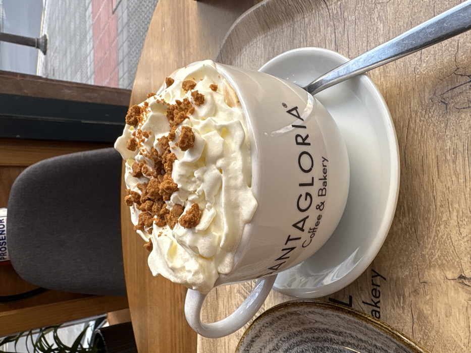 - "A white mug, displaying the black text "SANTAGLORIA Coffee & Bakery," is centrally positioned, filled with a beverage and generously topped with whipped cream and numerous crumbled brown biscuit pieces" by FM-IFDN82, licensed under CC BY 4.0