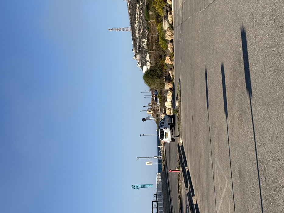 The scene depicts a coastal parking area in Rosh HaNikra, within the Mate Asher Regional Council, Israel, under a clear, cloudless blue sky during daylight hours