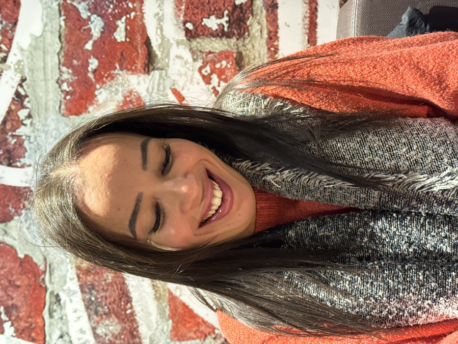 A smiling woman with long, dark hair is wearing an orange sweater and a grey patterned scarf. Her eyes are closed and she's looking down. The background is a textured wall with red and white paint that resembles brick. She appears to be indoors, possibly by a window given the light on her face.