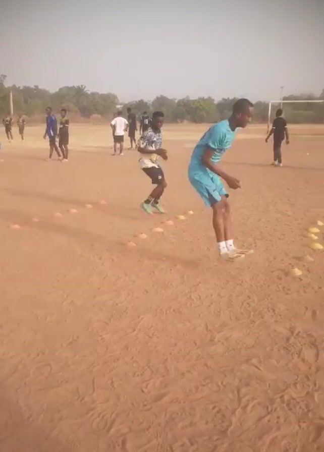 multiple young men doing agility drills on a dirt field, running in between orange cones set in a row. The players are wearing different colored shirts and shorts. In the background are other players standing around, as well as a soccer goal. The sky is a clear, pale blue.