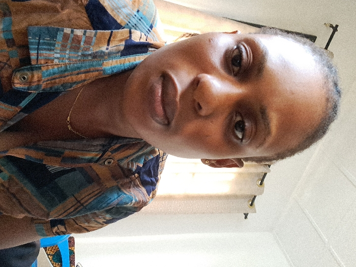 An adult female subject with dark skin is depicted in a close-up indoor portrait. Her hair is pulled back, revealing a clear forehead. She has a neutral expression, looking directly forward. The subject is wearing a collared, button-up shirt with a plaid pattern in shades of brown and blue. A thin gold chain necklace with a small central embellishment is visible around her neck, and a small gold stud earring is present in her right earlobe. The background consists of a light-colored wall or ceiling. A light-colored curtain with dark grommets is visible on the right side, hanging from a dark rod. A partial view of a blue object, possibly furniture, topped with a colorful patterned fabric is visible in the lower right background. The location is the city of Unknown, Unknown.