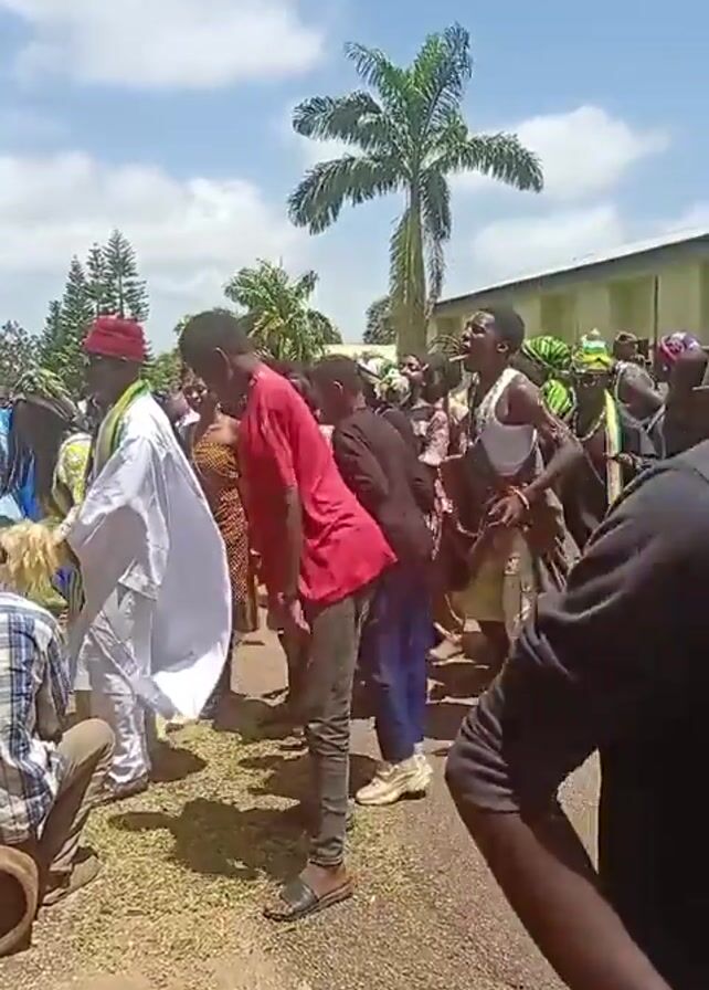 group of people dancing outdoors on a sunny day with scattered clouds. In the foreground, a young man in a dark grey long-sleeved shirt and dark pants dances towards the camera, smiling and gesturing. Behind him, a diverse crowd of people, some in traditional attire, dances and celebrates. One man wears a white robe and a red fez-like hat. There are palm trees in the background and what appears to be a light-colored building. The scene appears to be a cultural event or celebration. The camera seems to be handheld, providing a slightly shaky perspective of the lively atmosphere.