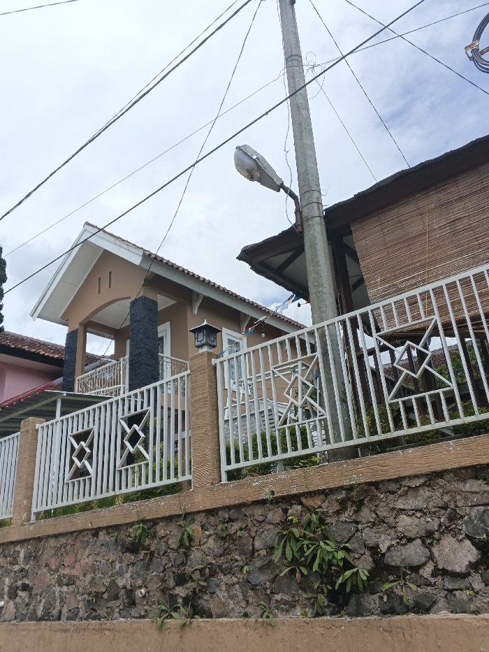 The image displays an exterior view of a residential area in Unknown, Vietnam, under an overcast sky. In the foreground, a brown stone retaining wall with visible mortar and scattered green foliage is topped by a lighter brown horizontal barrier. Above this, a white metal fence with vertical bars and integrated square/diamond geometric designs extends across the frame. Behind the fence, two residential structures are visible. The primary building on the left is a two-story house featuring a light brown facade, white eaves, and a terracotta-tiled roof. It has a small balcony on the second floor with a white railing and two dark, possibly stone, pillars supporting the roof overhang. A black ornamental lantern is affixed to a fence post in front of this house. To the right, another structure is partially visible, characterized by a dark roofline and a large, brown, woven bamboo-style blind covering an opening. Green vegetation is present behind the fence, surrounding the buildings. Centrally positioned in the right half of the image is a grey concrete utility pole, from which a grey street lamp extends. Multiple black utility lines and cables crisscross the sky, connecting to the pole and extending beyond the frame. No individuals are present, and no actions or interactions are depicted.