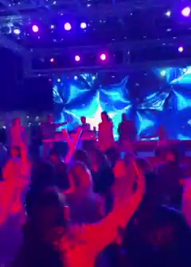 crowded dance floor with people dancing in front of a stage. On the stage, a DJ stands behind a table with a large "V" logo. To the right of the DJ, a woman in a light-colored outfit and two men are dancing on the stage. Behind the performers, a large LED screen displays abstract, colorful patterns that shift and change. The scene is lit with a combination of blue, red, and purple stage lights. People in the crowd are raising their hands and appear to be enjoying the music. The overall atmosphere is energetic and lively.