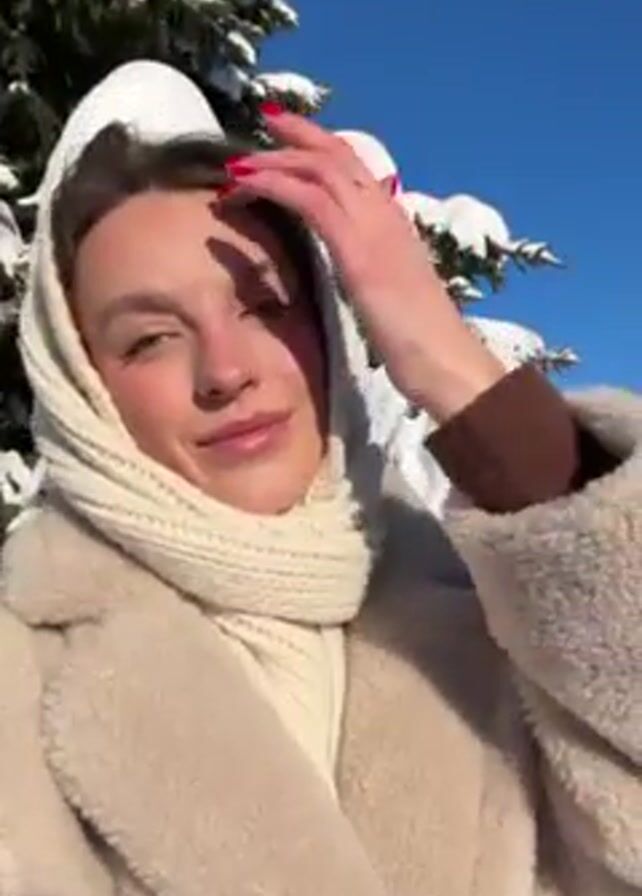 A woman is standing outside on a sunny day in a winter environment. She is wearing a beige, fluffy coat and a white, thick-knit scarf that is wrapped around her head like a headscarf. The sky is a clear, bright blue and there is a snow-covered evergreen tree behind her to the left. She has her hand up near her face, showing a large silver ring with a design on her right ring finger. Her fingernails are painted red. She smiles and appears to be talking to the camera.