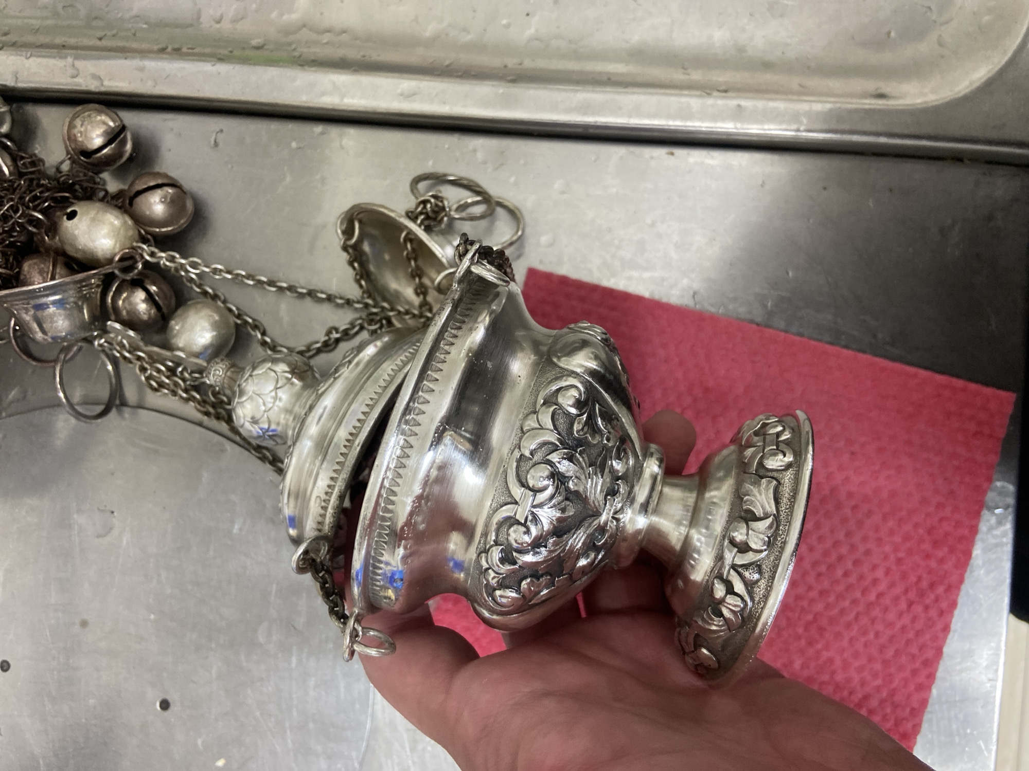 The image depicts a close-up, overhead view of a human hand holding an ornate, silver-colored censer (thurible) over a metallic utility surface. The location is an indoor setting in Donji Katun, Montenegro, specifically appearing to be a kitchen or wash area, though the precise spot within the city is not discernible from visual data. The censer, held by a light-skinned hand, is highly detailed, featuring intricate scrollwork and floral engravings on its main body and base. Its lid is partially open, revealing a gap, and is connected to a network of silver-colored chains. These chains extend upwards, attaching to several small, round, metallic bells and other decorative elements of varying shapes and sizes. Some bells display vertical slits. The hand grasps the lower part and base of the censer from the left side of the frame. Beneath the censer and hand, a crumpled, textured red cloth or towel is visible, extending towards the lower left. The underlying surface is a dull, scratched, and potentially wet metallic (likely stainless steel) countertop. To the right, a raised edge or lip suggests the presence of a sink basin. The metallic surface exhibits minor smudges and dark spots.