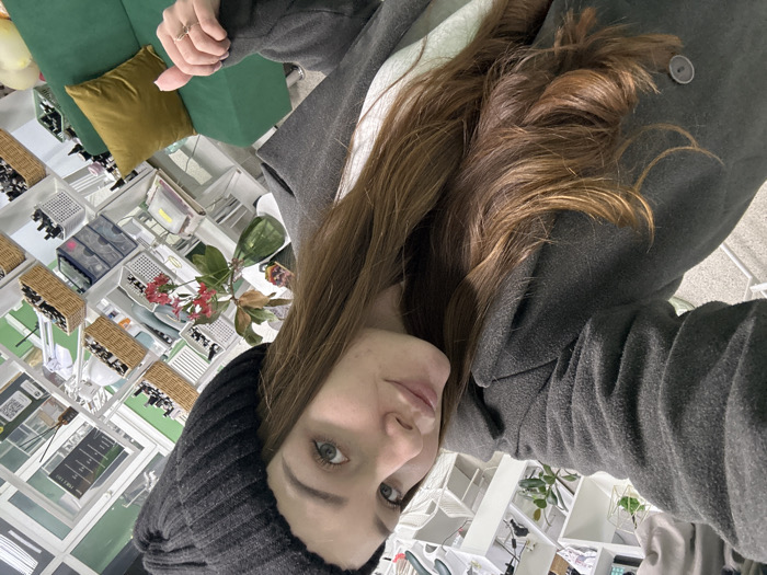 This image is a selfie taken by a young adult female indoors, in what appears to be a commercial establishment within the city of Chaikovsky, Russia. The subject, positioned centrally and angled slightly to her right, is a female with long, wavy brown hair featuring lighter highlights, which cascades over her left shoulder and chest. She wears a dark grey ribbed beanie and a charcoal-colored felt-like coat over a lighter garment. Her light-colored eyes are directed towards the camera, and she exhibits a slight smile. Her left hand, with painted fingernails and a ring on the ring finger, is visible in the lower right quadrant, holding an indistinct light pink object or making a gesture. The background shows a brightly lit indoor space with extensive white shelving units. These shelves are organized with numerous small bottles, jars, and containers, some stored in wicker baskets and clear plastic multi-compartment organizers. A vertical black sign with white text and a QR code is affixed to one of the upper shelves. Decorative elements include a small green plant in a gold-colored geometric pot on a shelf, and a glass vase containing red flowers and green foliage on a lower shelf. A section of a dark green sofa or bench with a mustard yellow throw pillow is visible in the lower right portion of the background.