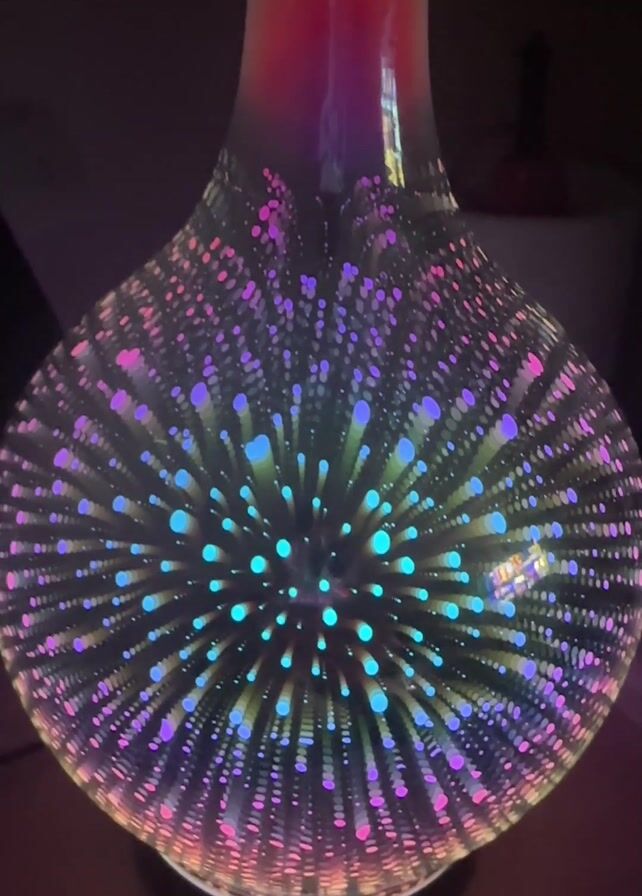 glass diffuser with a colorful light pattern emanating from the center, creating a starburst effect. The diffuser is shaped like a vase, with a wide base and a narrowing neck. The top of the neck is frosted. Steam is emitted from the top of the diffuser. The diffuser sits on a dark brown surface. The background is dark and blurry, suggesting a dimly lit room. Other objects are vaguely visible in the background.