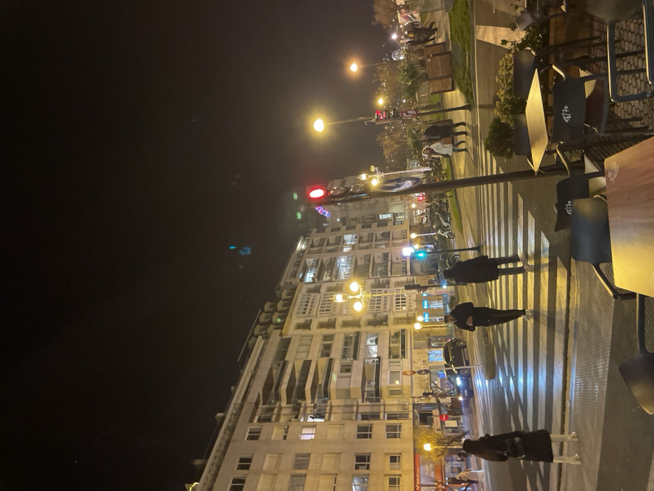 A nighttime street scene shows pedestrians crossing a zebra stripe crosswalk. A tall building with many windows dominates the background. Streetlights illuminate the area, casting shadows of the pedestrians. Traffic lights are visible, and parked motorcycles line the street. Tables and chairs of an outdoor cafe are present in the foreground. The photo is taken at an angle, with the right side tilted upwards.