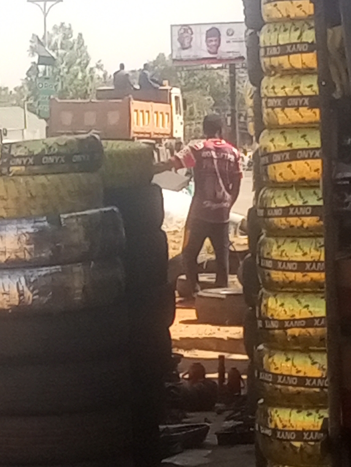 The image displays an outdoor, roadside scene in Jos, Nigeria. In the immediate foreground on the left, several dark-colored tires are stacked, with visible markings of "ONYX" on some. On the right, a tall vertical stack of light-yellow tires, each featuring a prominent black band with the text "XANO" repeated, frames the scene. In the mid-ground, a male individual is observed from behind, wearing a red short-sleeved shirt with "GOAL LIFTER" text and dark trousers. He stands on a low, dark-colored platform or object on unpaved, reddish-brown ground scattered with debris. His right arm is extended forward, partially obscured. In the background, a tan-colored dump truck is positioned on a road, with two indistinct human figures seated or standing within its open bed. Above the truck, a large billboard displays the headshots of two men, identifiable as political figures Bola Ahmed Tinubu and Kashim Shettima. The overall environment suggests an urban or semi-urban setting with visible trees and bright, possibly hazy, daylight conditions.