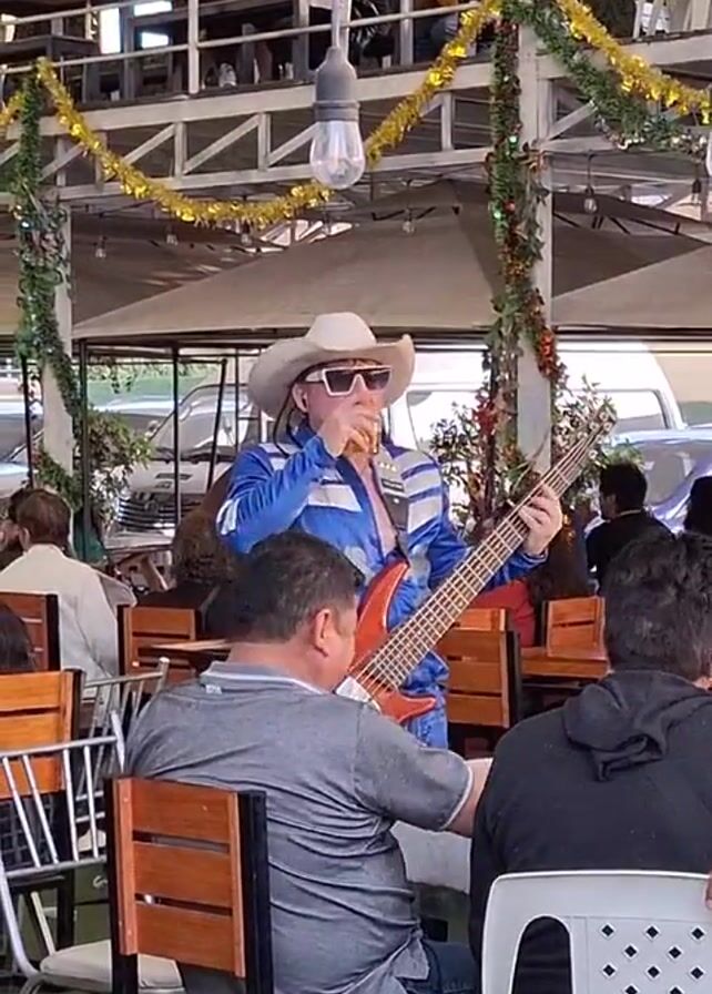 Here's a forensic description of the video: **Setting:** The video appears to be filmed at a restaurant or outdoor event space, identifiable by tables, chairs, and a partial roof structure decorated with garlands. A secondary level of the structure is visible in the background. Several parked vehicles are visible in the background. **People:** The primary subject is a male, possibly in his late 30s to 50s, wearing a cowboy hat, sunglasses, and a blue and white jacket. He is playing a bass guitar and holding a glass. Other individuals are seated at tables, appearing as customers, including two men seated at a table in the foreground. There are other people present in the background. **Objects:** Key objects include the bass guitar being played, glasses containing a yellow liquid (presumably beer), tables, chairs (wood and plastic), and restaurant decorations (garlands, light fixtures). **Actions:** The primary subject is actively playing the bass guitar and vocalizing. He raises his glass in a toasting gesture. The seated individuals at the tables seem to be listening to the music, and one person lifts a glass towards the camera to reciprocate the toast. **Interactions:** The musician interacts with the audience by playing music and toasting. The audience acknowledges his performance. **Environment:** The environment is a restaurant or event setting during what appears to be daylight hours. The atmosphere seems relaxed and festive.