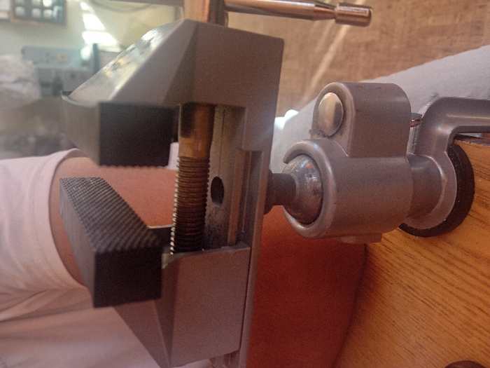 A grey, metallic, ball-joint mounted bench vise is secured via a C-clamp to a light-colored wooden surface, displaying prominent wood grain. The vise's jaws are partially open, holding a brass-colored threaded rod horizontally between them. The left jaw is fitted with a removable black rectangular jaw pad featuring a fine cross-hatch pattern, while the opposing jaw surface is dark and smooth. The ball joint mechanism, made of grey metal, includes a silver-toned locking knob on its right side. In the upper left background, the upper arm and shoulder of an individual wearing a white short-sleeved shirt are partially visible. Indistinct workshop machinery and tools are present in the distant right background. This scene is located in Sliven, Bulgaria.