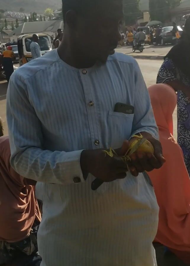 A man is peeling a yellow fruit with a small knife, standing near a table with more of the same fruit displayed. He wears a light blue striped long-sleeved shirt. Other people are nearby, some sitting. Vehicles and buildings are visible in the background, suggesting an outdoor market or street setting.