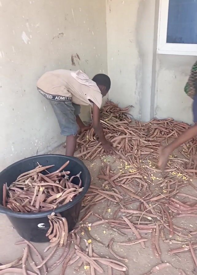Two children are placing brown pods into plastic tubs. There are several black and blue tubs filled with pods, and one tub filled with yellow kernels. A third child wearing a black shirt walks behind a blue plastic chair. A fourth child in a red dress walks toward the camera, and then away. There are pods strewn across the floor. The scene is outside, near a wall with two windows.