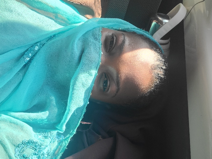 The image, rotated 90 degrees clockwise, depicts a close-up of a person from the upper chest level upwards, appearing to be in an enclosed space, possibly a vehicle interior. The person has dark skin, with only their eyes and forehead visible, peeking from beneath a light blue, semi-transparent head covering. The head covering is embellished with light blue sequins and intricate embroidery, particularly visible on the fabric to the lower left of the face. Strong sunlight illuminates the person's forehead and parts of the head covering. The eyes are open and directed towards the viewer. In the background, to the upper right of the person, a metallic object, possibly a thermos or bottle, with a white strap is visible, resting on a dark surface. A white vertical surface, possibly a vehicle interior panel, is present on the far right. A brown, textured material is visible behind the person's head on the far left. The specific location within Agunu, Nigeria, cannot be determined from the visual information provided in the image.