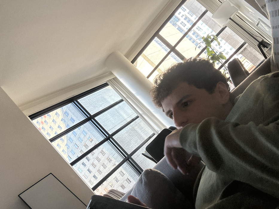 The image captures a young male reclining indoors within a high-rise apartment in Boston, United States
