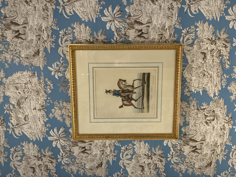 A framed print hangs centrally on a wall covered in blue and sepia Toile de Jouy wallpaper, depicting an interior scene in Paris, France. The wallpaper features a repeating pattern of exotic landscapes with dense foliage, palm trees, mountains, elephants (some bearing riders in howdahs), and a tiger in the lower right quadrant. The frame is rectangular, gold-colored, and elaborately detailed with reeding on its inner edge. The artwork itself is a colored print, matted with a double off-white border. It portrays a military figure in a blue jacket, red breeches, and a tall shako-style hat, riding a light brown horse to the right. The horse is depicted in motion, likely trotting or cantering. Visible text below the horse on the print reads "Voltigeur."