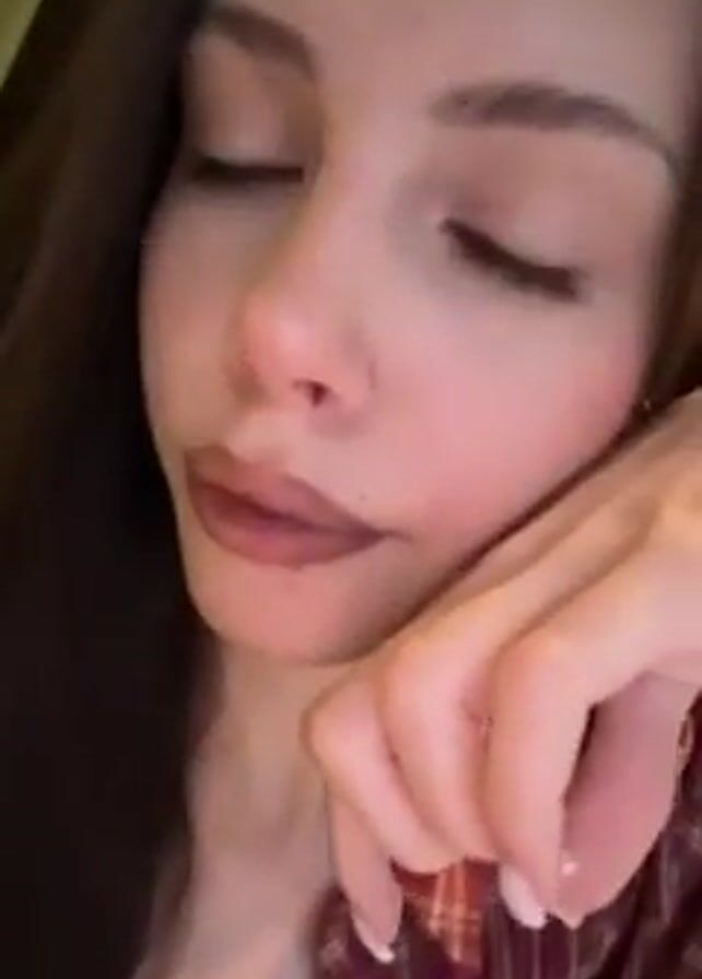 A young woman with brown hair and fair skin is in the frame, looking directly at the camera