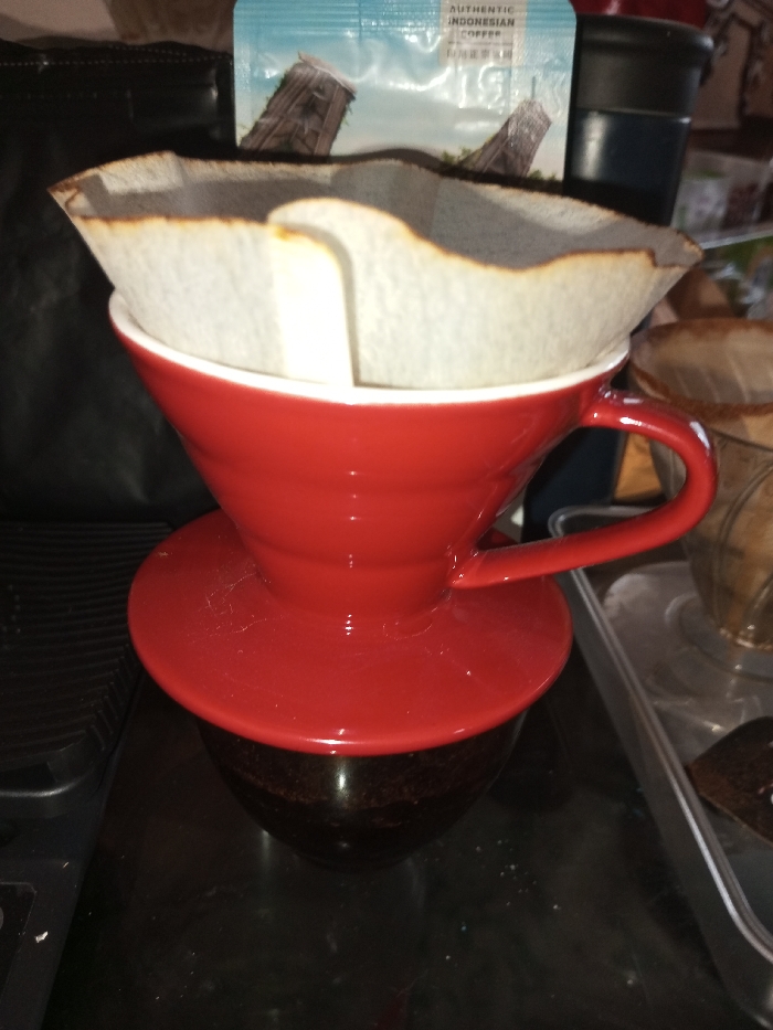 A red ceramic pour-over coffee dripper sits atop a glass carafe. A paper filter is fitted inside the dripper. Behind, a bag of "Authentic Indonesian Coffee" is visible, and a black coffee mug is partially in frame. The scene is set on a dark, reflective surface, possibly a kitchen counter. A metallic tray with miscellaneous items is also visible in the background.