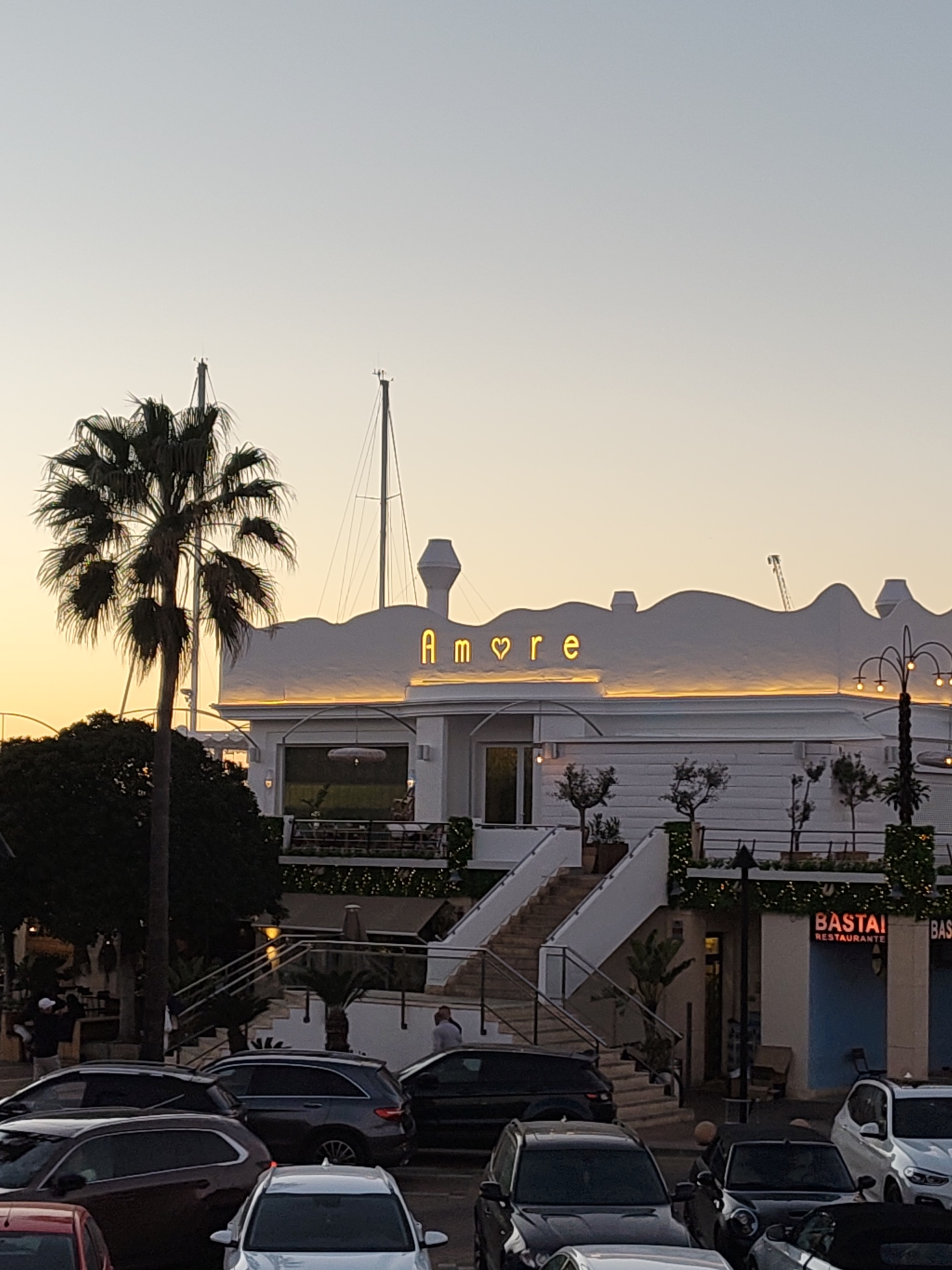 waterfront scene in Dénia, Spain. The primary focus is a white, two-story building with a decorative, undulating roofline. The word "Amore," with a heart symbol replacing the "o," is illuminated on the roof. The building appears to be a restaurant or entertainment venue, suggested by the patio seating visible through the windows and the festive garland decorating the exterior. To the left of the building stands a tall palm tree. In front of the building, a parking lot is filled with parked cars. To the right of the building, a partial view of another establishment with signage that includes the word "BASTAI Restaurante" is visible. The sky is a gradient of yellow and light blue, indicating either sunrise or sunset.