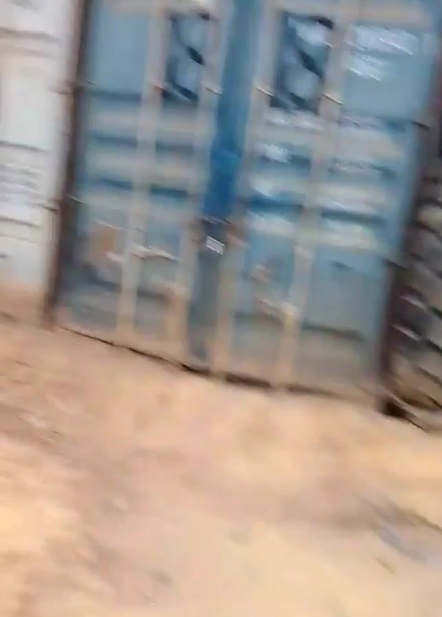 series of shipping containers, numbered 19 and 18, sitting on a dirt surface. A large tire is shown next to the container labeled 19, and the camera then moves closer to the container labeled 18, which contains two large tires inside.
