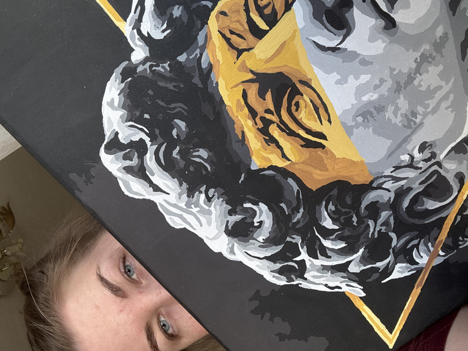 The scene is located in the city of Chaikovsky, Russia. The image presents a close-up, angled view of a woman partially obscured by a painting she is holding. The woman's fair-skinned face is visible on the left side of the frame, showing her forehead, light brown eyebrows, and blue eyes that look directly forward. Her light brown hair is pulled back, with a glimpse of a red garment visible on her lower left shoulder. The majority of the frame is dominated by a rectangular canvas painting held diagonally, with its top-left corner positioned closer to the viewer. The painting features a stylized depiction of a classical marble bust, resembling the head of Michelangelo's David, rendered in a segmented, paint-by-numbers style. The background of the painting is solid black. The bust's hair and upper facial features are painted in shades of black, gray, and white. A prominent diagonal band of golden orange with black tiger-like stripes cuts across the mid-section of the bust's face, covering the eye area. The lower portion of the bust, including the nose and mouth region, is depicted in varying shades of gray. A golden yellow geometric line forms a triangle in the lower left corner of the painting, partially framing the bust. In the blurry background above the woman's head, a light-colored ceiling fixture is discernible, indicating an indoor setting.