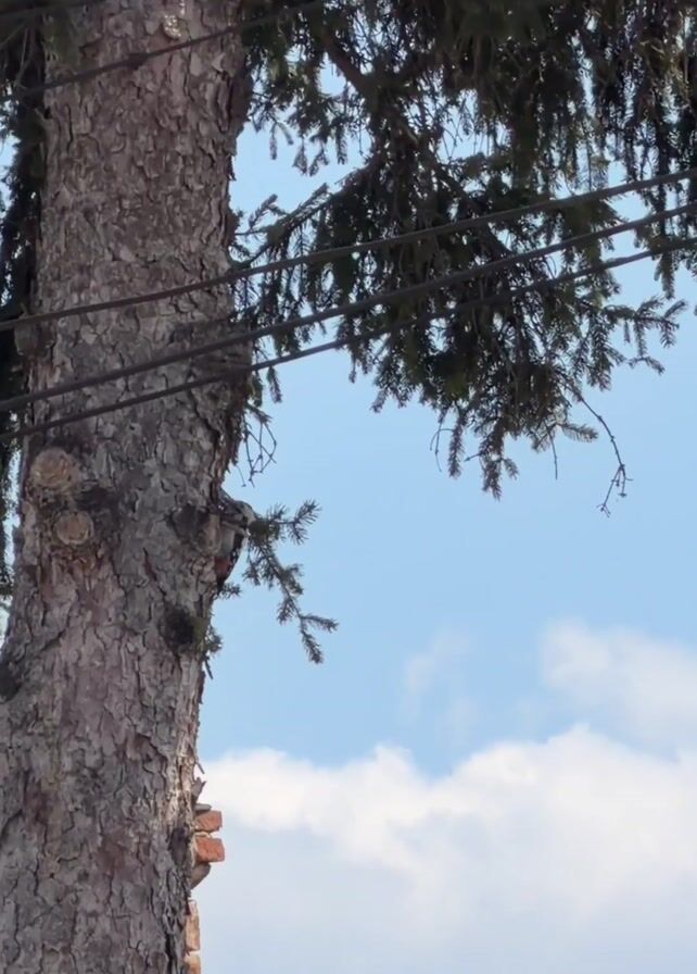 woodpecker clinging to the side of a tree trunk. The tree is large and rough-barked, with branches and pine needles visible against a backdrop of blue sky with scattered white clouds. Power lines run horizontally across the frame, partly obscuring the view of the tree. The woodpecker has black and white plumage with a red patch on its lower body. The bird is actively pecking at the tree bark. A portion of a red-tiled roof is visible in the lower left corner.
