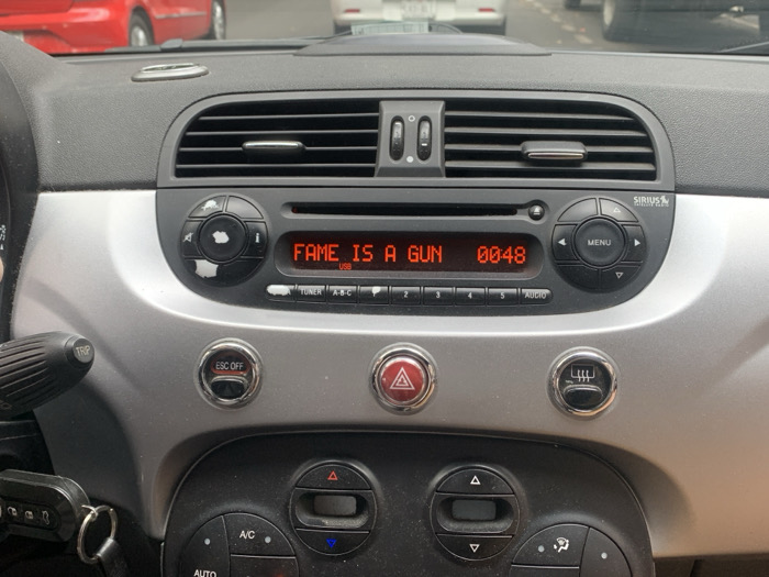 The image depicts the interior dashboard of a Fiat 500 vehicle, viewed from the driver's perspective. The central infotainment system displays "FAME IS A GUN" and "00:48" in red LED text, with "USB" indicated below the text. A SiriusXM logo is visible on the right side of the unit. Some buttons on the infotainment system, including the volume/power knob, show signs of wear. Below the air vents and infotainment system, a silver panel contains an "ESC OFF" button, a red hazard warning light button, and a rear defrost button. Lower on the console are climate controls for air conditioning, fan speed, and temperature. A set of car keys on a black keyring is visible on the lower-left side of the frame. Through the windshield, other vehicles, including a red car on the left and a lighter-colored vehicle further back, are visible, indicating the car is on a road or in traffic during daylight hours. The specific location within Mexico City, Mexico, is not identifiable from the visual content.