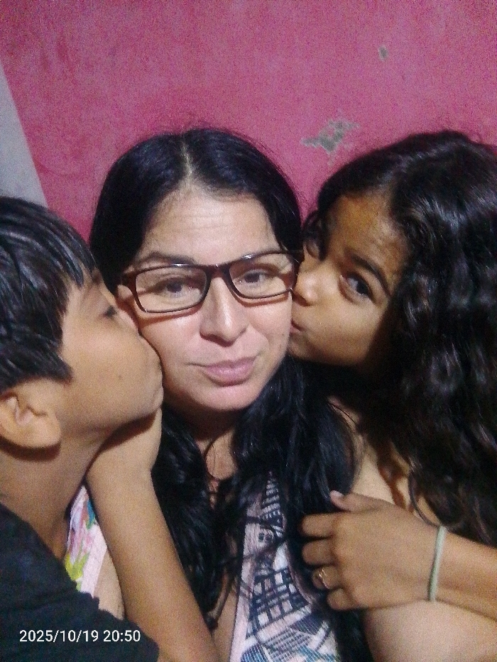 A close-up indoor portrait features three individuals against a textured, solid pink wall, located in the city of Unknown, Unknown. A central adult female, with dark hair and dark-framed eyeglasses, looks towards the camera with a neutral expression. On her left, a male child, estimated to be 5-10 years old, is kissing her left cheek; his right arm is partially visible. On her right, a female child, also estimated to be 5-10 years old, with long dark curly hair, is kissing her right cheek. This female child's left hand, adorned with a light-colored bracelet and a ring, rests on the adult's upper chest. The adult wears a light-colored top with a geometric pattern. The background wall exhibits minor imperfections and variations in color. A digital timestamp "2025/10/19 20:50" is present in the lower-left corner of the image.