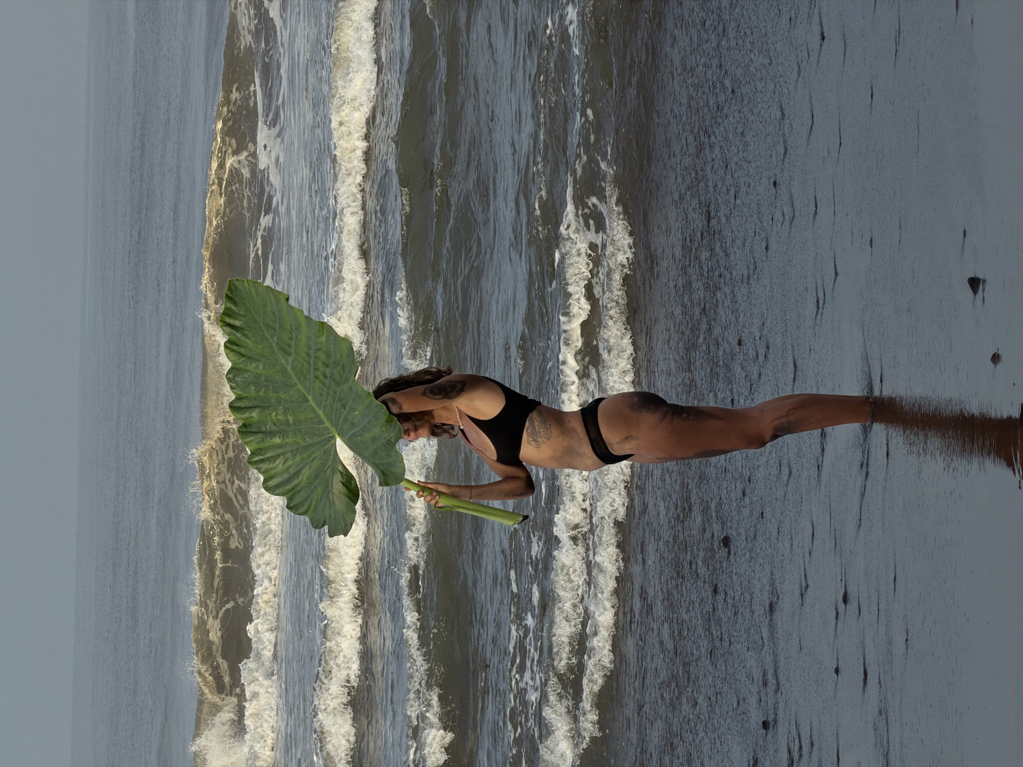 In Sudimara, Indonesia, a single female subject stands in shallow water on a dark, wet shore. She is positioned in profile, facing right, with her head tilted upwards, and wears a black bikini. Dark, wet smudges, consistent with sand or mud, are present on her lower limbs, torso, and arms. She holds a large, green, heart-shaped leaf with a prominent stem above her head. The ocean behind her displays multiple lines of breaking waves with white foam. The sky appears uniformly light gray.