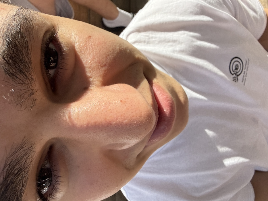 A close-up, slightly upward-angled view of a person's face and upper body. One eye is in sharp focus, revealing dark eyelashes and eyebrow. The nose and lips are visible in detail, showing skin texture. The person wears a white t-shirt with a dark logo printed on the chest. Part of another person's leg and sock is visible in the background, suggesting an outdoor setting with bright sunlight casting shadows on the face and shirt.