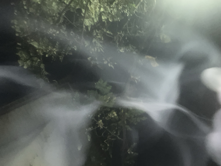 A blurred night scene with branches and leaves visible in the upper half. Wisps of fog or mist swirl through the image, obscuring the lower portion. The overall tone is dark, with the fog adding an ethereal or mysterious quality. The leaves appear to be silhouetted against the dark background.