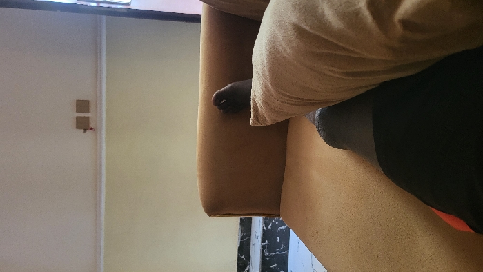 This image captures an indoor domestic setting in the city of Babawa, Nigeria. The perspective is low, showing the lower extremities of an individual reclining on a tan upholstered couch. The individual's dark-skinned right foot, which is bare, rests on the top edge of the couch's backrest. A light beige pillow is positioned on the individual's left leg, partially obscuring it, with a dark sock visible on the foot/ankle area. The individual is wearing dark shorts or pants, with a minimal orange fabric detail visible on the inner thigh. To the left of the couch, a floor with black and white patterned marble or tile is visible. The wall behind the couch is painted a light yellow, transitioning to a white ceiling featuring a decorative trim. Two light-brown square electrical outlets or covers are mounted on the upper wall section; a small red wire-like object protrudes from the left outlet. A vertical bright light source is visible along the far right edge, suggesting a window or door opening.