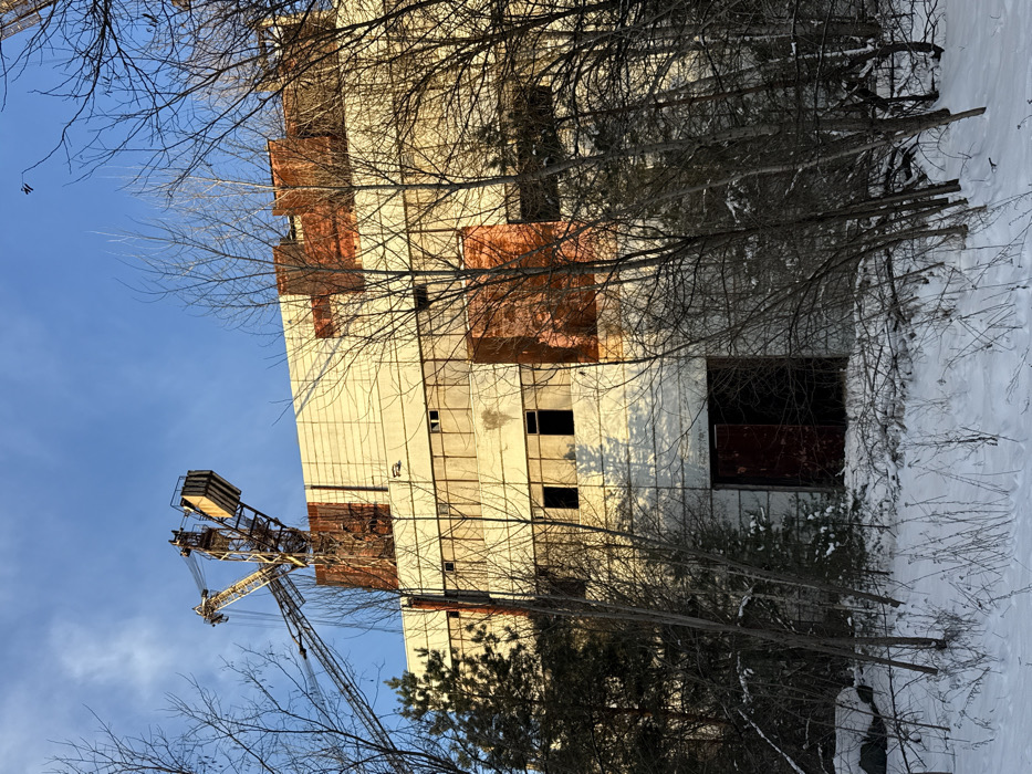 A large, concrete building dominates the frame, its facade marked by discoloration and rectangular indentations. A tall construction crane stands adjacent to the building. Leafless trees obscure portions of the structure and crane. A snow-covered ground stretches to the building's base, adding to the wintry scene. The sky is blue.