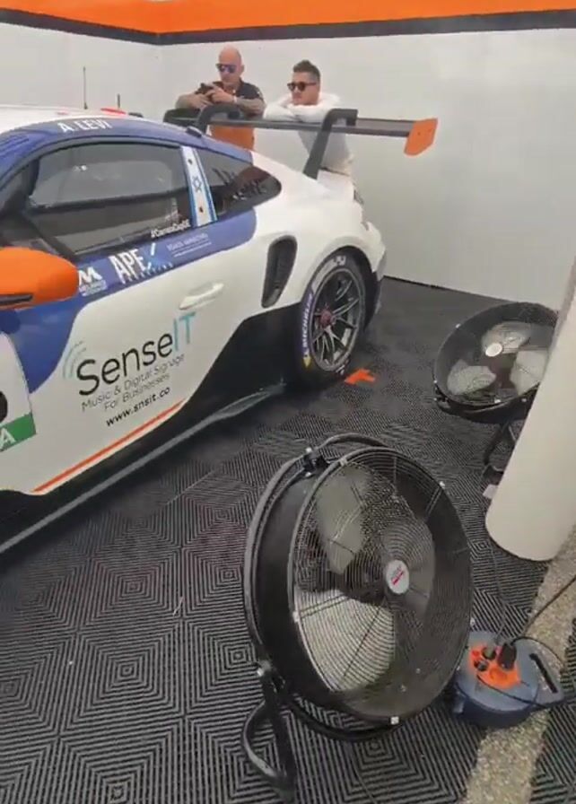 A video shows a race car team’s garage with a blue, white, and orange Porsche GT3 race car parked inside. Two men in the background are watching the team work on the car. There are two large fans and a speaker set up to keep the team cool and entertained. A man wearing a DEKRA shirt and a camera is filming the car and the team. Other people in racing suits can be seen in the background. The garage has a black and grey checkered floor, and the walls are decorated with racing logos. There is very loud music playing.