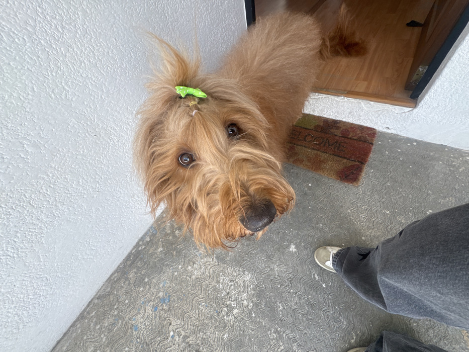 - "A Goldendoodle with a green barrette stands on a textured gray concrete surface" by FM-NVhht2, licensed under CC BY 4.0