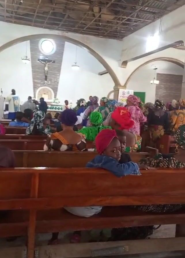interior of a church with people sitting in wooden pews. Most of the people visible are women, many wearing colorful traditional African clothing and headwraps. At the front of the church, near the altar, are several people in white robes. A crucifix is mounted on the wall above the altar. The ceiling of the church is unfinished, revealing the underlying structure. A small child sits in the foreground, leaning against the back of a pew, observing the scene. Music and singing can be heard, indicating a service or ceremony is in progress.