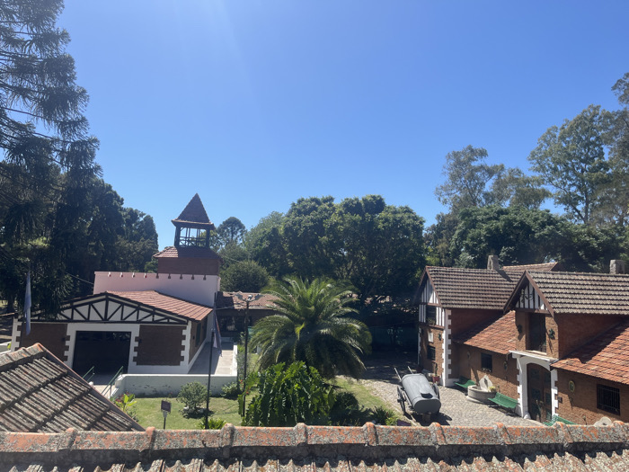 This image depicts an elevated view of a building complex in Quilmes Oeste, Argentina, under a clear, bright blue sky. The foreground features the reddish-brown tiled roof of an unseen structure. The midground showcases multiple buildings with European-influenced architecture, characterized by reddish-brown tile roofs, dark brown half-timbering, and brick or light-colored walls. To the left, a light-colored building with a large, dark entrance or garage opening is visible, topped by a square tower with a gabled, tiled roof. Two white flags are flown near this structure, which is surrounded by a patch of green grass and paved walkways. To the right, a series of brick buildings with similar half-timbering and tiled roofs includes an arched wooden doorway and several windows. Between these structures, a paved courtyard or driveway contains a large palm tree and other green foliage. A dark grey, cylindrical tank or barrel on a cart with wooden wheels is positioned in the courtyard. Adjacent to one of the brick buildings, a small white fountain with a basin and green benches is discernible. The entire complex is surrounded by dense, mature green trees that form a natural backdrop against the clear sky. No individuals or active interactions are observed.