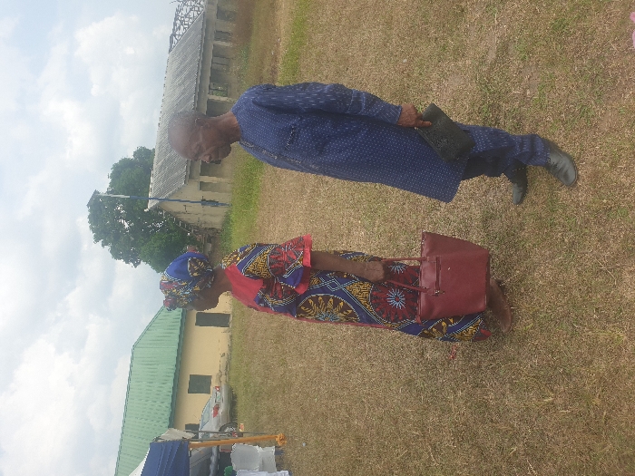 Two individuals stand on a grassy expanse under a cloudy sky. A woman in a patterned blue, red, and yellow dress with a matching headwrap has a maroon purse on her arm. Beside her, a man in a blue patterned outfit and dark shoes holds a black object. In the background are buildings with light-colored walls and roofs. Part of a tent structure with white chairs is visible in the lower left.