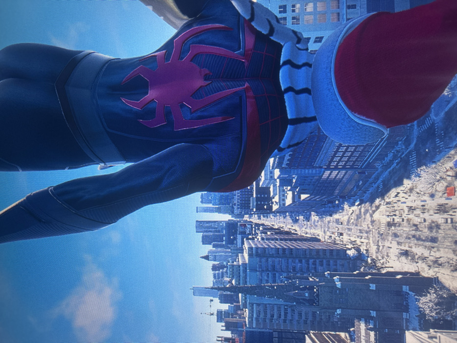 A low-angle, upside-down view of Spider-Man in his blue and black suit with a red spider emblem on his back. He also is wearing a Santa hat. The backdrop is a cityscape with skyscrapers and snow-covered streets under a blue sky. The buildings vary in height and architectural style. The perspective is from above, looking down onto the city below.