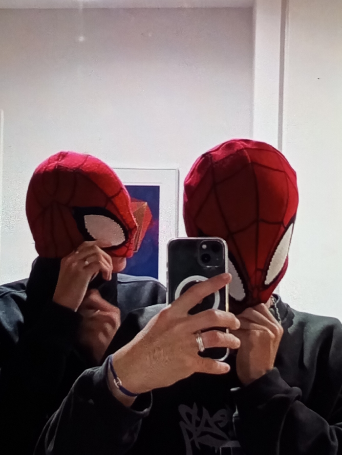 Two individuals wear Spider-Man masks. One person holds a phone, presumably taking a selfie of them both in a mirror. Both wear rings on their ring fingers. The individual holding the phone also has a blue bracelet with an anchor charm. They are wearing dark jackets or hoodies. A framed picture hangs on the wall behind them.