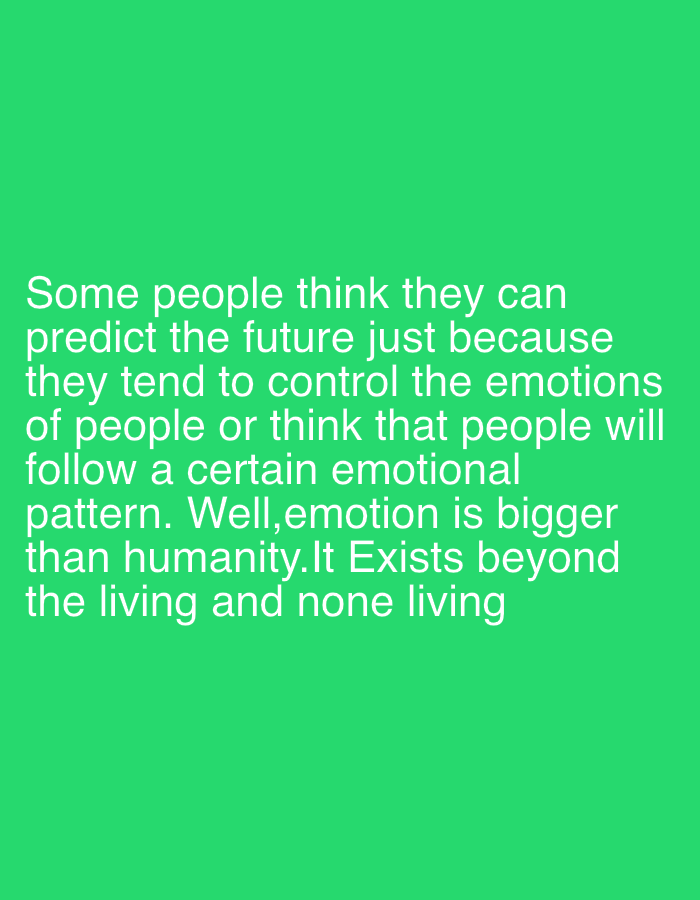 The image is a digital graphic featuring white text on a bright green background. The text consists of a paragraph expressing the opinion that some people believe they can predict the future by controlling or understanding the emotions of others. The paragraph concludes with the assertion that emotion is greater than humanity and exists beyond the living and non-living. The image provides no information about a location or city.