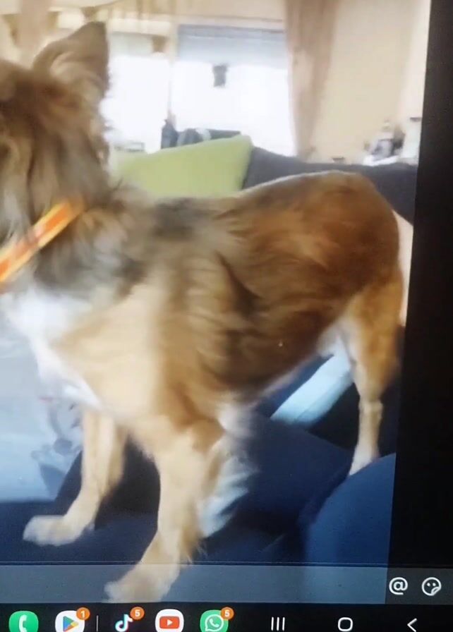 A video shows a small brown and white dog standing on a person's lap. The dog has long, fluffy fur and is wearing an orange collar. The person is sitting on a couch, which has a green pillow on it. In the background, there is a window with curtains and a string of triangle pennants hanging from the ceiling. The video is being watched on a tablet.