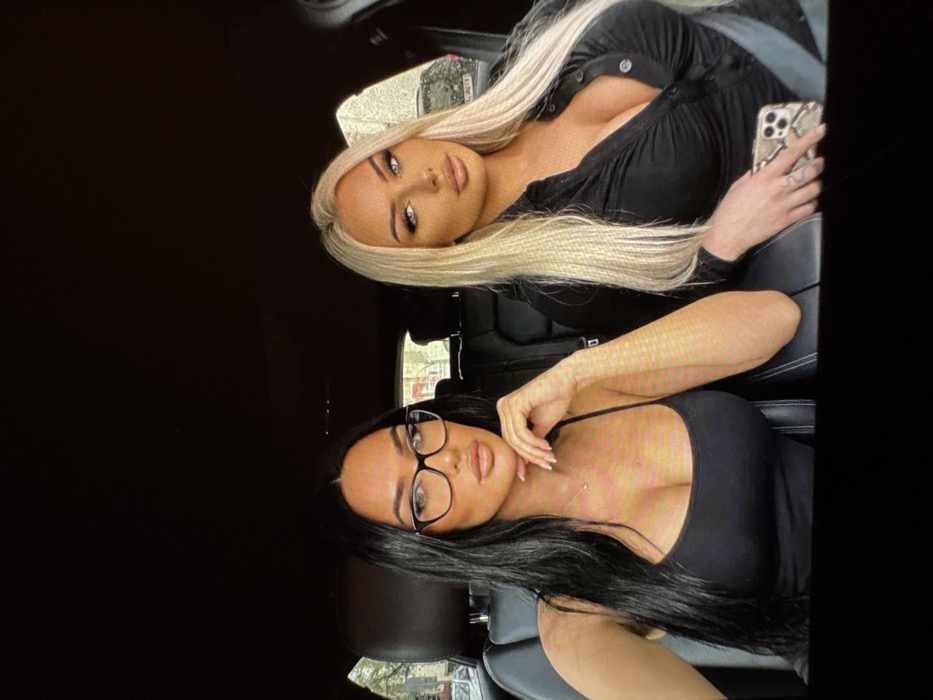 The image displays two adult females inside a vehicle, likely posing for a photograph