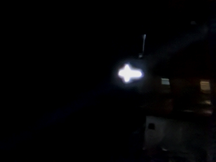 The image displays a brightly illuminated white Latin cross set against a predominantly dark, nocturnal sky. The cross glows intensely, appearing as the primary light source in the frame. Faint, dark architectural forms are discernible in the lower half of the image, suggesting a large stone edifice. Specifically, a block-like structure with a dark, recessed opening is visible to the lower left of the cross. To the right of the cross, a dark, angled structural element extends. Subtle warm-toned light sources, possibly windows, are faintly visible further below. This scene depicts the illuminated cross atop the Cathedral of Saint Gregory the Illuminator in Yerevan, Armenia, observed during nighttime.
