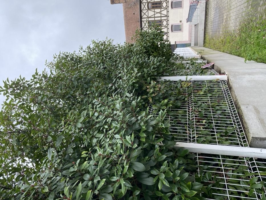 The image depicts an outdoor scene in Erstein, France, characterized by dense vegetation and a building under an overcast sky. In the foreground, a light grey concrete retaining wall runs from left to right, supporting a white metal mesh fence. This fence, composed of vertical bars and horizontal reinforcements, is largely obscured by a thick, dark green hedge growing behind and through its structure, extending significantly upwards and outwards. The hedge exhibits numerous oval-shaped leaves and reddish stems, suggesting a healthy, mature plant. To the right of the hedge and fence, a two-story building of traditional architectural style is visible. Its upper section features prominent dark brown half-timbering against a lighter facade, while the lower section is a solid light color. The building is topped with a red-tiled gabled roof, from which a brick chimney rises on the right side. Several rectangular windows with white frames and security grilles are visible on the building's facade. A paved area, possibly a courtyard or pathway, extends from the base of the building, partially overgrown with sparse green vegetation. A small, partially obscured round object, predominantly red and white, lies on the ground near the base of the fence on the right side. The sky is uniformly grey and overcast, indicating a cloudy day. No individuals or active subjects are present in the frame.