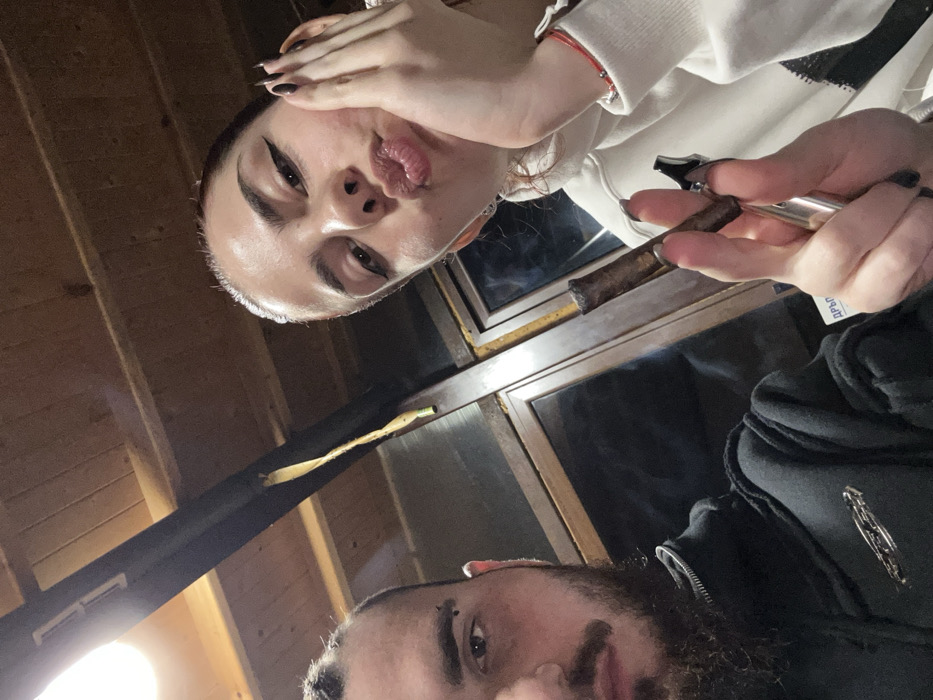 This image depicts two individuals, one male and one female, in an indoor setting identified as Kabile, Bulgaria. The composition appears to be a selfie taken from a low angle. The female, positioned on the right, faces the camera directly with pursed lips. She has dark hair and pronounced black winged eyeliner. Her left hand rests against her cheek, displaying dark fingernail polish. Her right hand holds a lit cigar emitting smoke between her index and middle fingers, and a metallic vaping device below it. She wears a white hooded sweatshirt, and a red string bracelet is visible on her left wrist. The male, partially visible on the left, has dark braided or dreadlocked hair, a full beard, and a mustache. A piercing is visible above his left eye. He looks directly at the camera and wears a dark zippered jacket featuring a metallic emblem on the left chest area. The background shows a light-colored wooden plank ceiling with visible beams. An exposed light bulb illuminates the upper left corner. Behind the individuals, a large window or glass panel reveals a dark outdoor environment. A frayed yellow strap or cord hangs from a wooden beam near the window, and a white label with Cyrillic text, possibly "ДРЪПН", is affixed to the lower window frame.